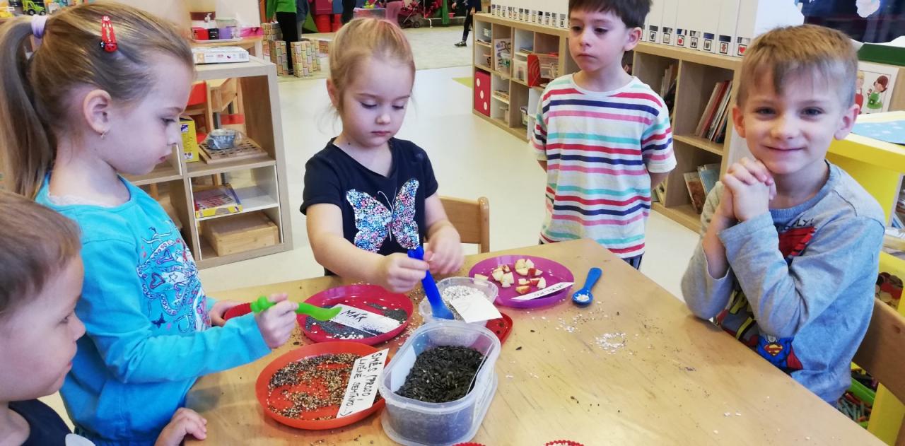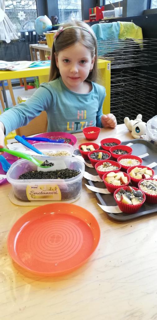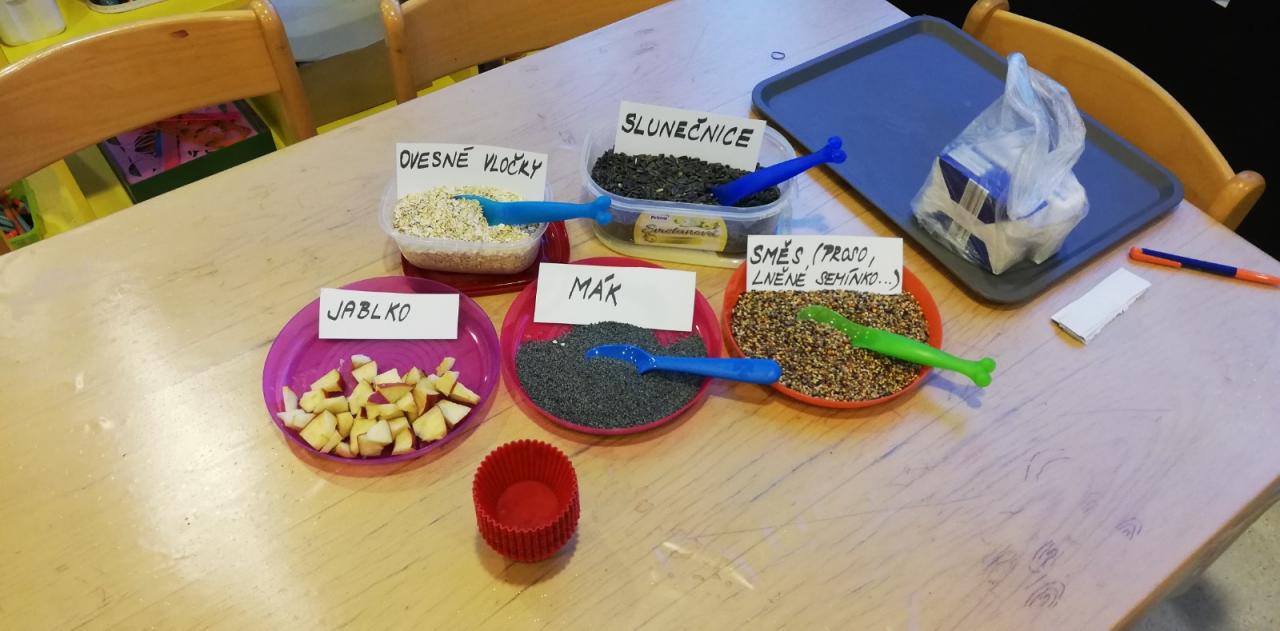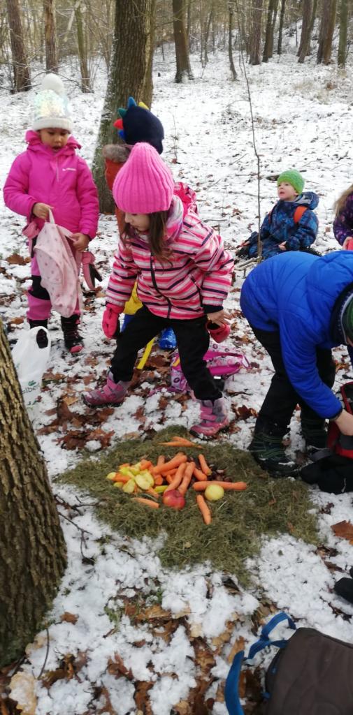 Děti ze Slunečnic připravily různé dobroty pro zvířátka. Pro ptáčky semínka, pro ostatní zvířátka jablíčka, mrkev, kaštany. Vše uschovaly do baťůžků a vydaly se jednoho mrazivého dne do blízkého lesa. Zvířátkům připravily hostinu. Cestou zpět do školky hledaly a určovaly ve sněhu stopy. Výlet do lesa se velmi vydařil.