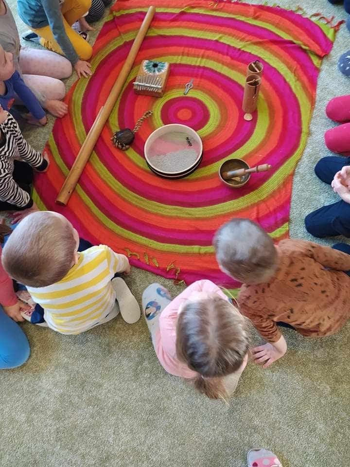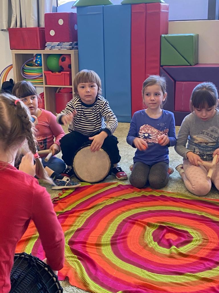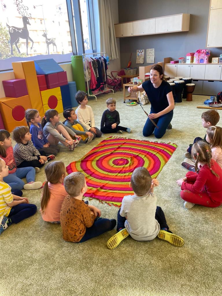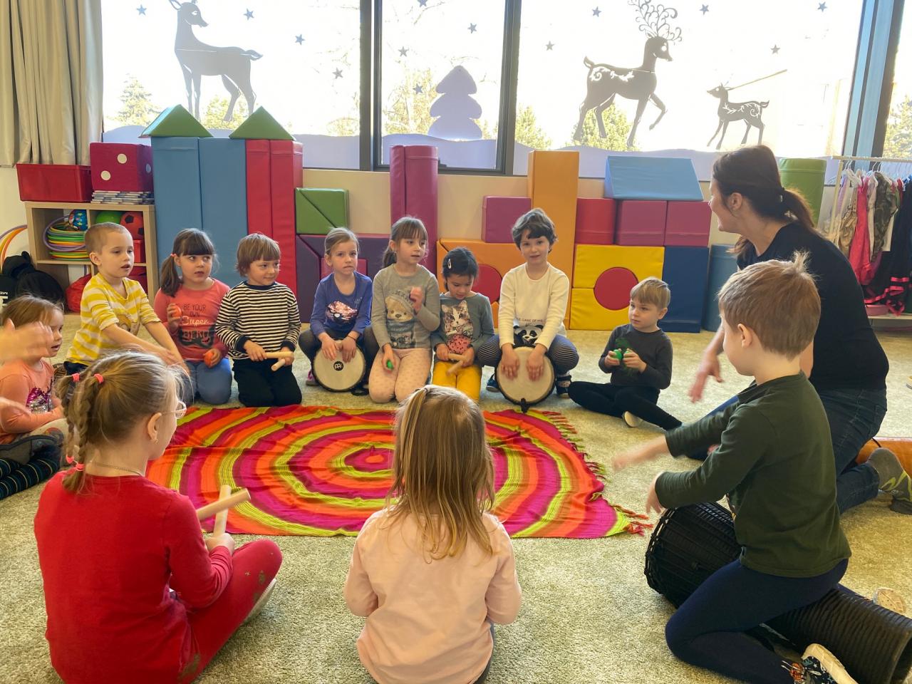 V poutavém programu si děti vyzkoušely hru na různá chrastítka, bubny a dřívka.