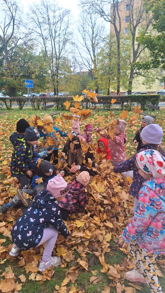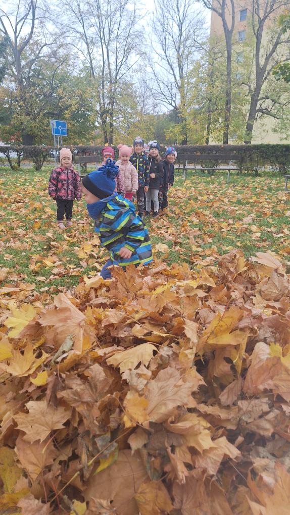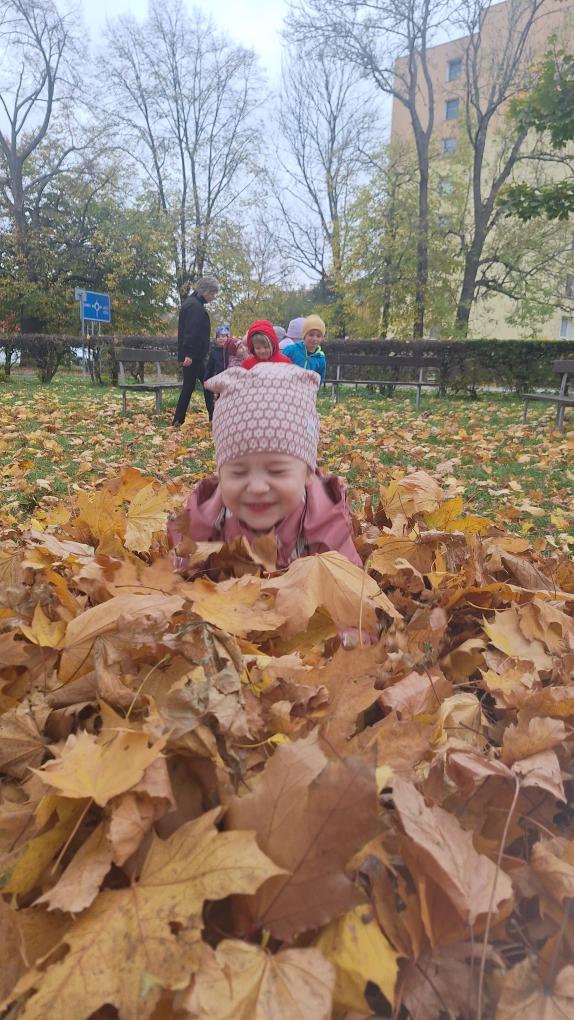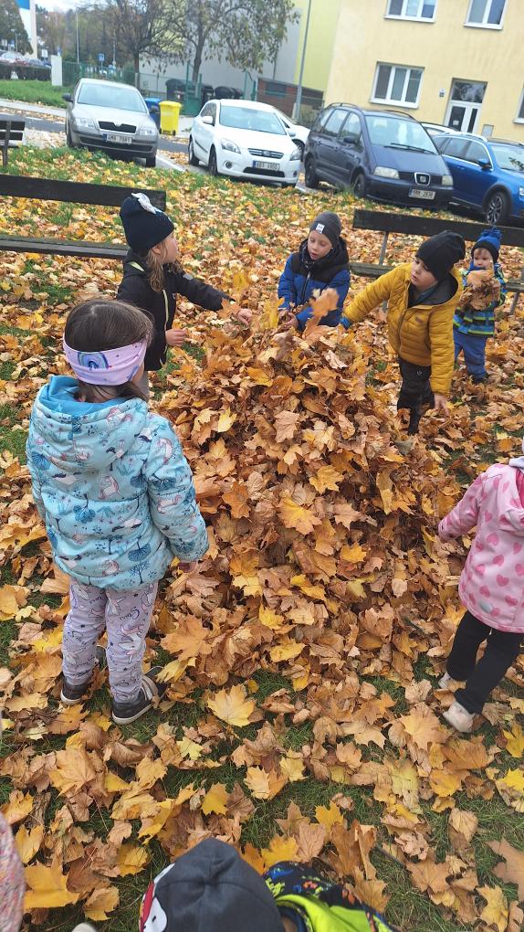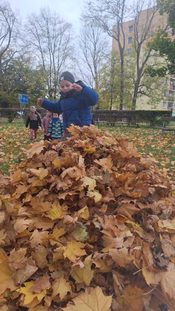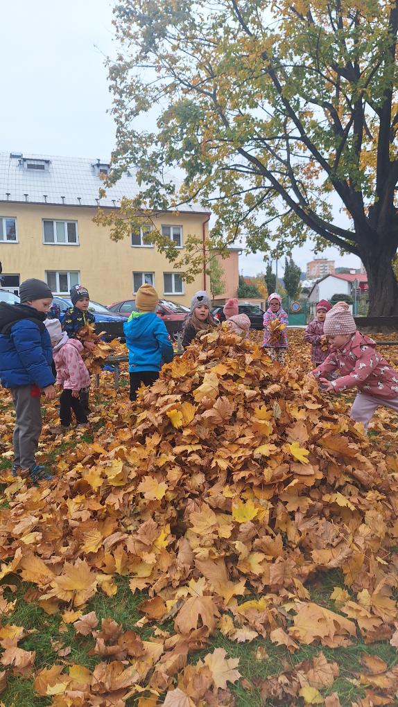 Děti ze třídy Sluníček se vypravily na listí. Udělaly si velikou hromadu a pořádně se vyřádily.