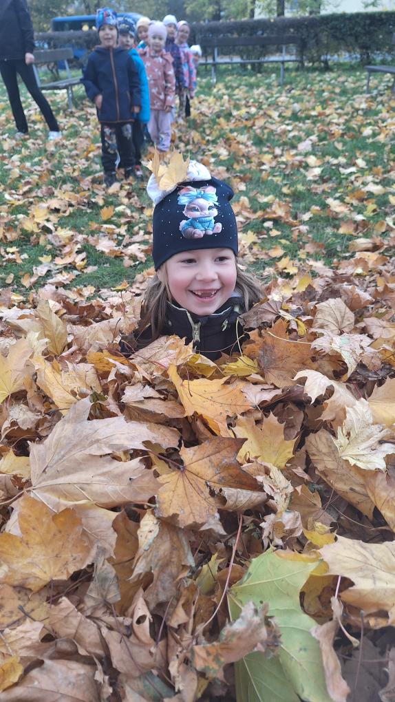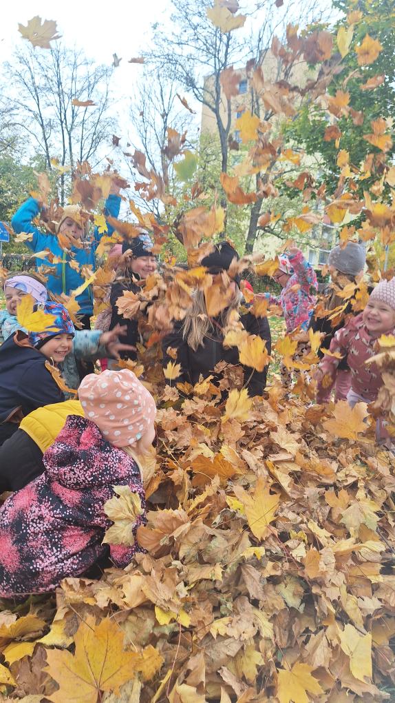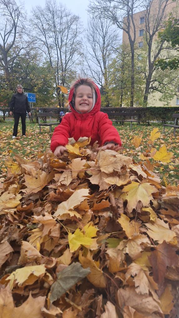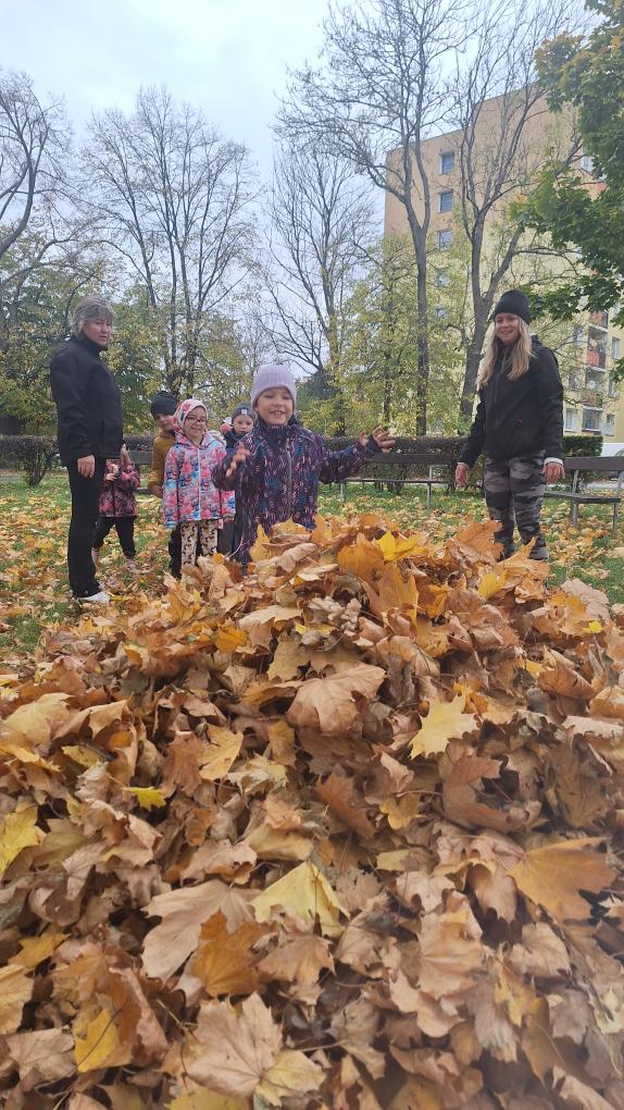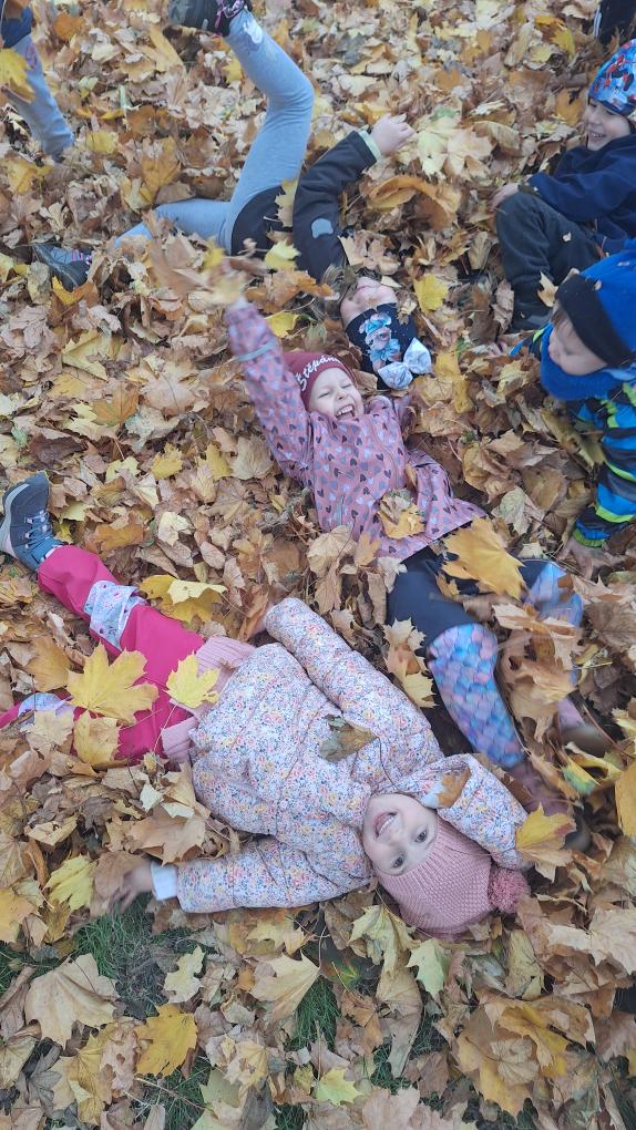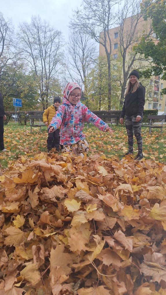 Děti ze třídy Sluníček se vypravily na listí. Udělaly si velikou hromadu a pořádně se vyřádily.